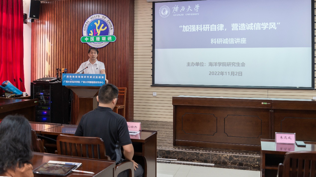 讲座首先由院党委副书记朱迅成老师致辞,朱老师和同学们说明了举办此次讲座的目的和意义,希望同学们应当严于律己,诚信科研。