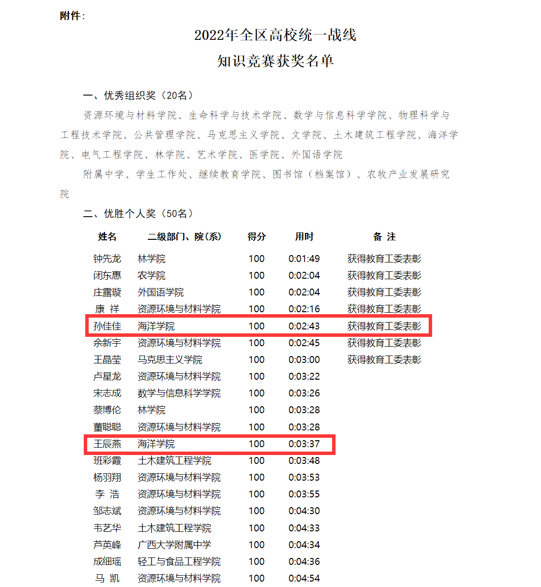 近日,自治区党委教育工委公布了“喜迎党的二十大 奋进新征程”2022年全区高校统一战线知识竞赛结果。太阳成集团122ccvip在答题中组织成效显著、师生成绩优异,荣获优秀组织奖。太阳成集团122ccvip孙佳佳同学、王辰燕同学在大赛中荣获“优胜个人奖”,其中孙佳佳同学为我校获得教育工委表彰的7人之一。