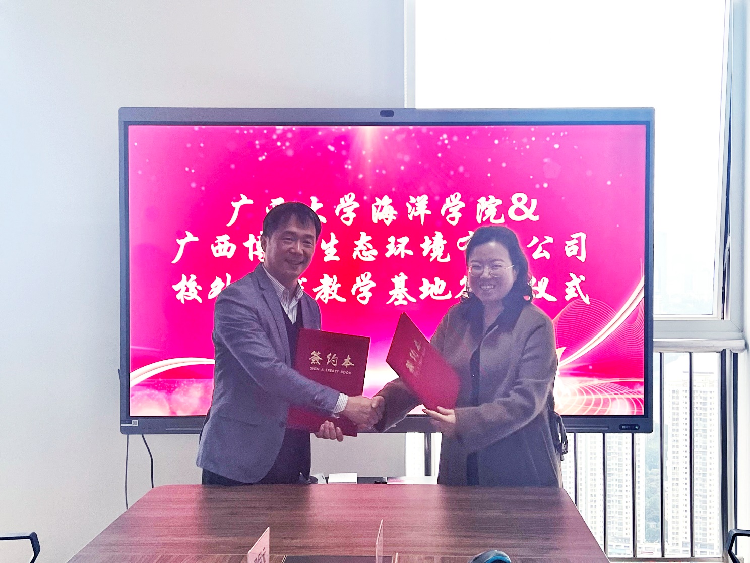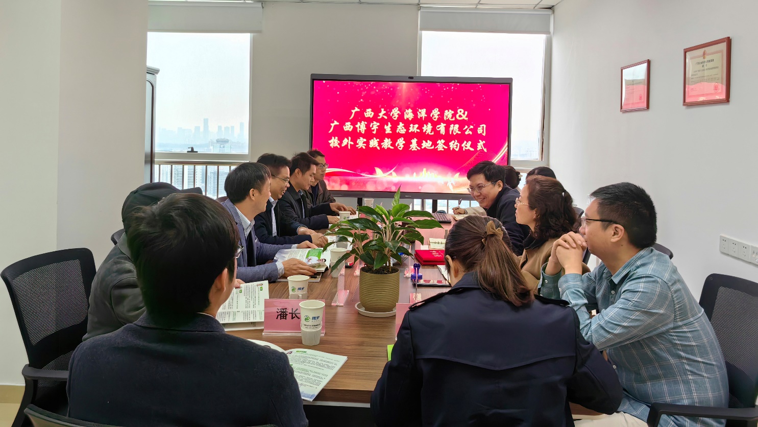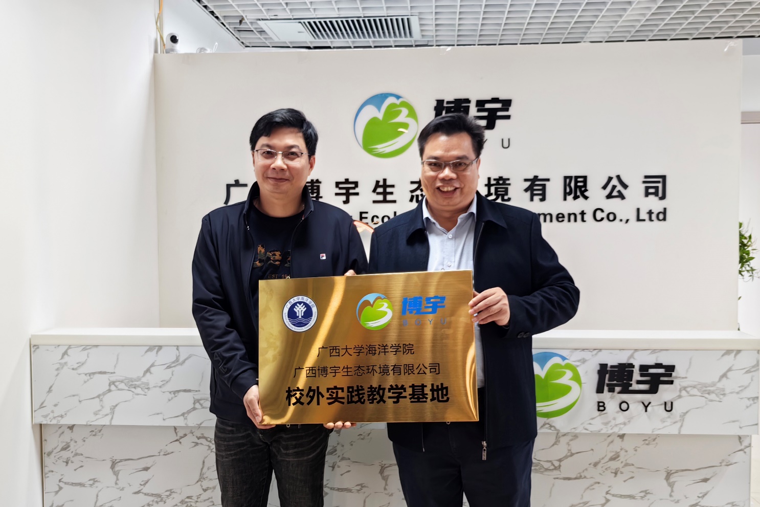 2023年3月28日,太阳成集团122ccvip与广西博宇生态环境有限公司举行大学生校外实践教育基地协议书签署暨授牌仪式。院党委副书记朱迅成与广西博宇生态环境有限公司副总经理文丰玉分别在建立大学生校外实践教育基地协议书上签字, 院党委书记谭运阳代表学院将“大学生校外实践教育基地”的牌匾授予广西博宇生态环境有限公司总经理邓杰。多位太阳成集团122ccvip毕业的博宇高级技术合伙人等出席签约授牌仪式。