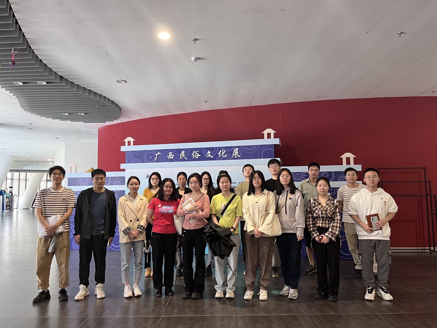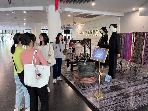 分享会后,大家来到大学生活动中心一楼参观了广西民俗文化展。在多种多样的劳作工具及精美的民族服饰、工艺品前,同学们纷纷打卡拍照,热烈交流,加深了对壮族、苗族、彝族、回族、水族等传统文化、习俗的认识,增进各族同学之间的交融交往。