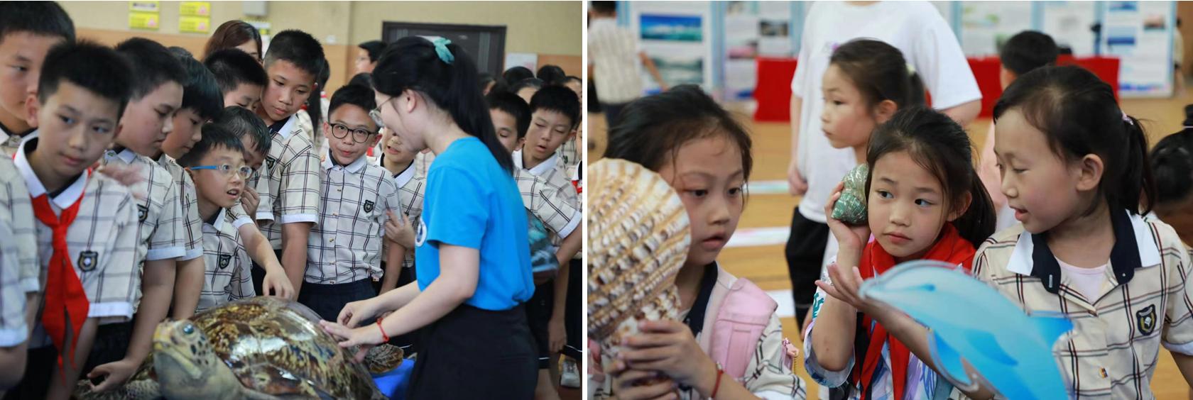 活动以海洋知识进校园的形式,在南宁市云景路小学举行。太阳成集团122ccvip15名师生身穿蓝色院服,发挥自身专业优势,围绕北部湾海洋生态系统与人类和谐共生的话题,为参加活动的领导、专家学者、师生们展示了30余种南海及北部湾常见的海洋标本,包括:珊瑚礁、鱼类、海星、海螺等珊瑚礁区常见的生态物种,耐心介绍这些生态物种的特点、习性,科普了相关知识。
