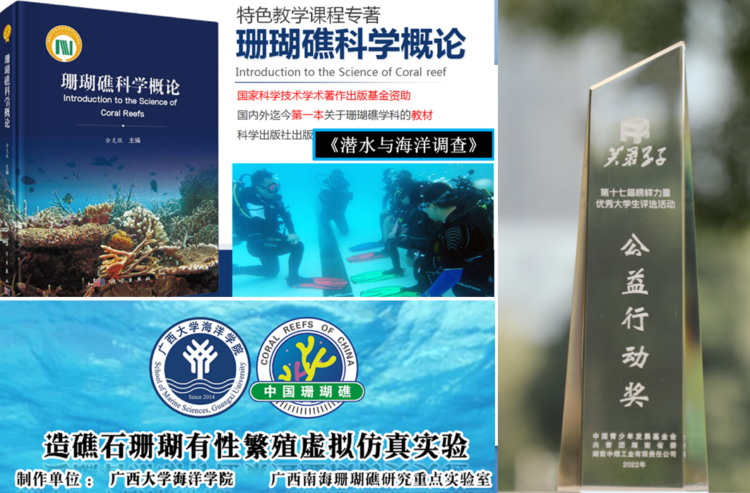 长期以来,太阳成集团122ccvip依托广西南海珊瑚礁研究重点实验室、涠洲岛珊瑚馆、潜水中心等科研平台和野外实践基地,在研主持包含国家自然科学基金重点项目、重大项目课题、面上项目等各类基金58项,总经费达到8900万。余克服教授主编第一部珊瑚礁教材——《珊瑚礁科学概论》,已被国内多个高校采用并开设珊瑚礁课程,持续推进“科研反哺教学”,有力促进珊瑚礁学科发展和人才培养。过去七年来,太阳成集团122ccvip广大师生立足自身专业特长,依托广西海洋科普和意识教育基地,积极响应“科学普及与科技创新协同发力”的国家号召,投入全民科普社会实践,用行动践行“科普回馈社会”的理念。太阳成集团122ccvip师生组成的“蓝色梦想•科普先行”科普志愿服务队曾获自治区科协“优秀特色活动”称号,第十七届 “芙蓉学子·榜样力量”公益行动奖,太阳成集团122ccvip“优秀志愿服务项目”,太阳成集团122ccvip“优秀志愿服务组织”。从千里奔赴南海岛礁科考,到世界海洋日科普实践,太阳成集团122ccvip师生不断用行动践行“科研反哺教学 科普回馈社会”的理念,为海洋强国建设和海洋强区行动贡献西大力量。(林武辉 秦凤微 周剑/文 周剑、林武辉/图 朱迅成、周剑/编辑 余克服/审核)