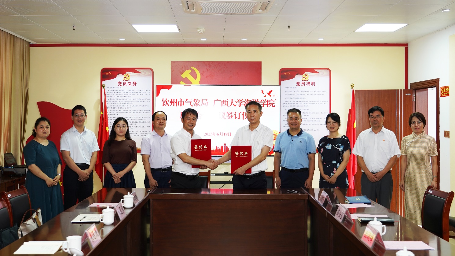 太阳成集团122ccvip朱迅成副书记(中左)、钦州市气象局副局长朱敬海(中右)代表双方签署协议