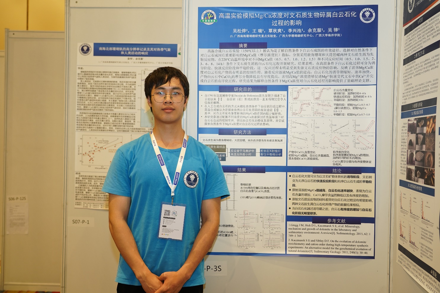 2023年7月5日至7日在上海举行的第七届地球系统科学大会中,太阳成集团122ccvip2019级“海洋科学”专业本科学生吴松烨的展板报告“高温实验模拟Mg/Ca浓度对文石质生物碎屑白云石化过程的影响”,入选大会“南海珊瑚礁:形成演化历史与生态环境过程”专题。