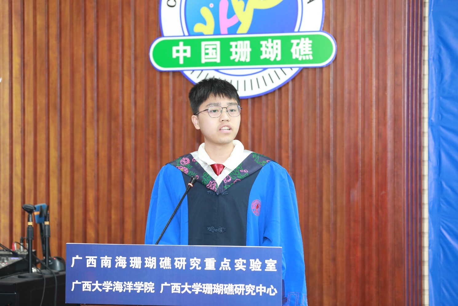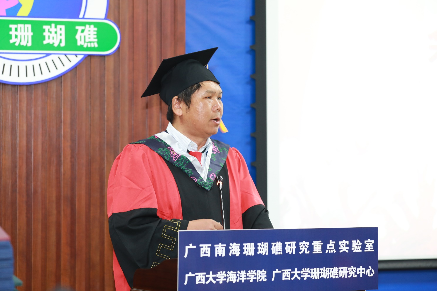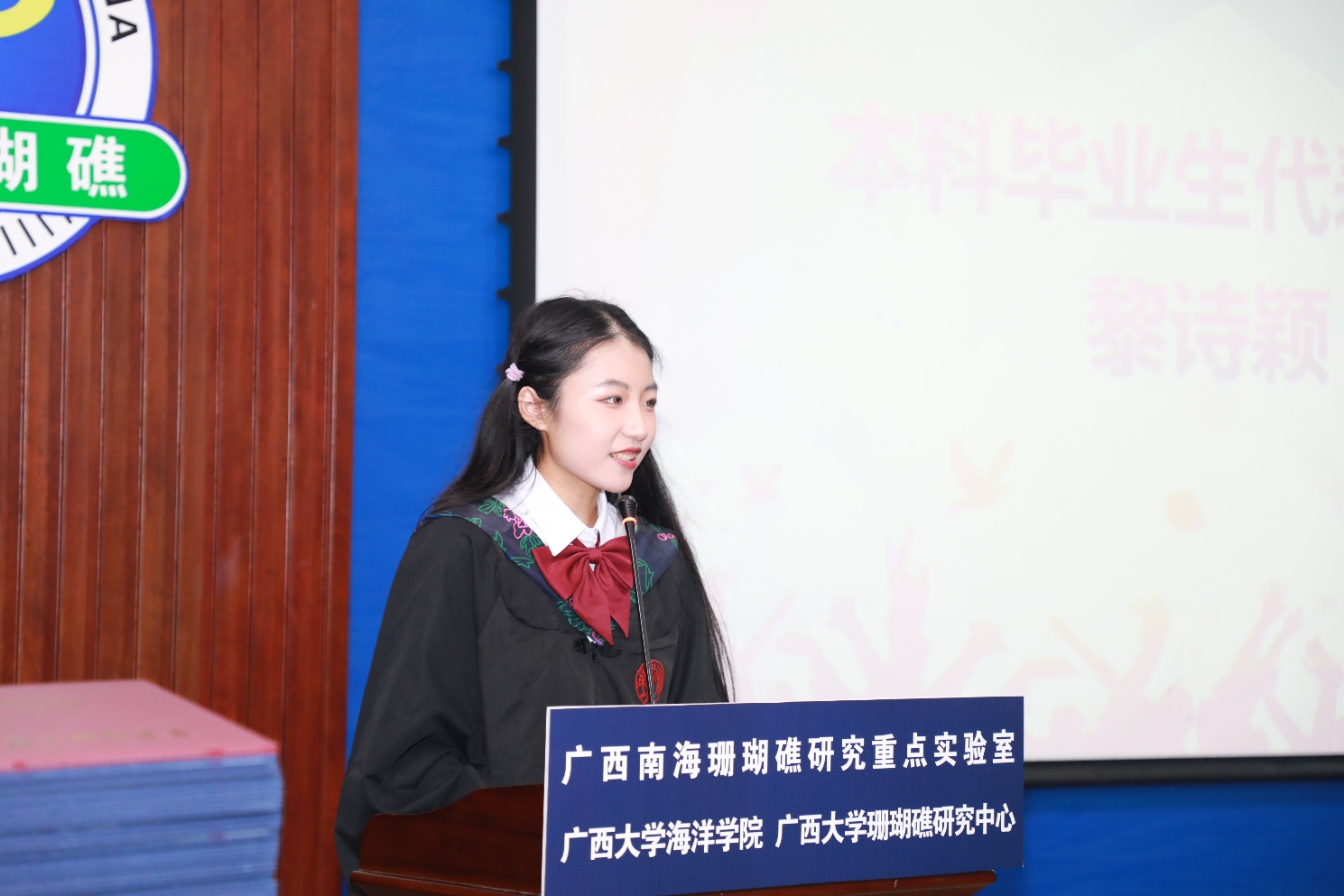 海洋科学2022级本科生毕业生代表、2023届太阳成集团122ccvip优秀毕业生获得者黎诗颖对学院提供优秀的学习环境和成长平台表示感谢,回顾了大学四年在专业知识、组织协调能力、团队协作能力和沟通表达能力等的成长和收获,对辛勤耕耘的老师、家人、朋友、同学表示感谢,对未来继续实现自己的梦想而努力奋斗。海洋科学2023届硕士毕业生代表梁日升作为太阳成集团122ccvip建设的见证人,讲述了2016年本科入学以来他眼中的学院、在学院的成长之路,他以导师余克服教授赠予的“科学研究必须要脚踏实地,欲速不达”与同学们共勉,并分享了在求学、科研路上的点滴感悟,以此相互激励。教师代表、海洋科学2019级2班班主任苏宏飞老师以他颇具特色的口音向同学们致以衷心的祝福,并对同学们提出了几点建议与期待:勇于改变,主动明确目标向好前进;甘于奉献,勇于牺牲小我成就大家;守于心田,坚守不忘初心无愧时代。
