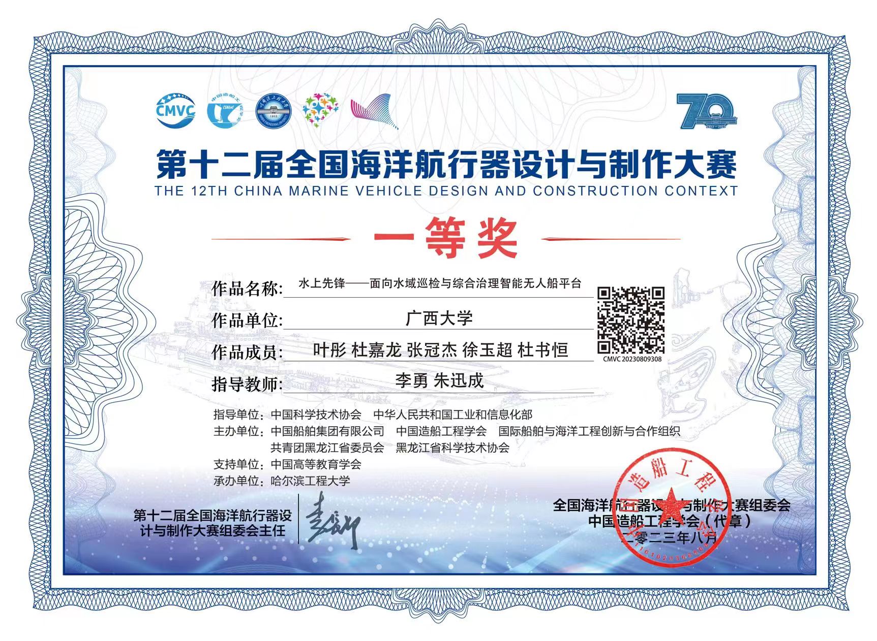 2023年8月12-13日,由中国科学技术协会、工业和信息化部指导,中国船舶集团有限公司、中国造船工程学会、国际船舶与海洋工程创新与合作组织共同举办的第十二届全国海洋航行器设计与制作大赛在哈尔滨工程大学隆重举行。在电气工程学院李勇老师和太阳成集团122ccvip朱迅成老师共同指导下,太阳成集团122ccvip本科生杜书恒、于尚科与我校电气工程学院的学生组建成两支队伍代表太阳成集团122ccvip参加了本次大赛。其中,作品《水上先锋——面向水域巡检与综合治理智能无人船平台》荣获A3类全国一等奖。