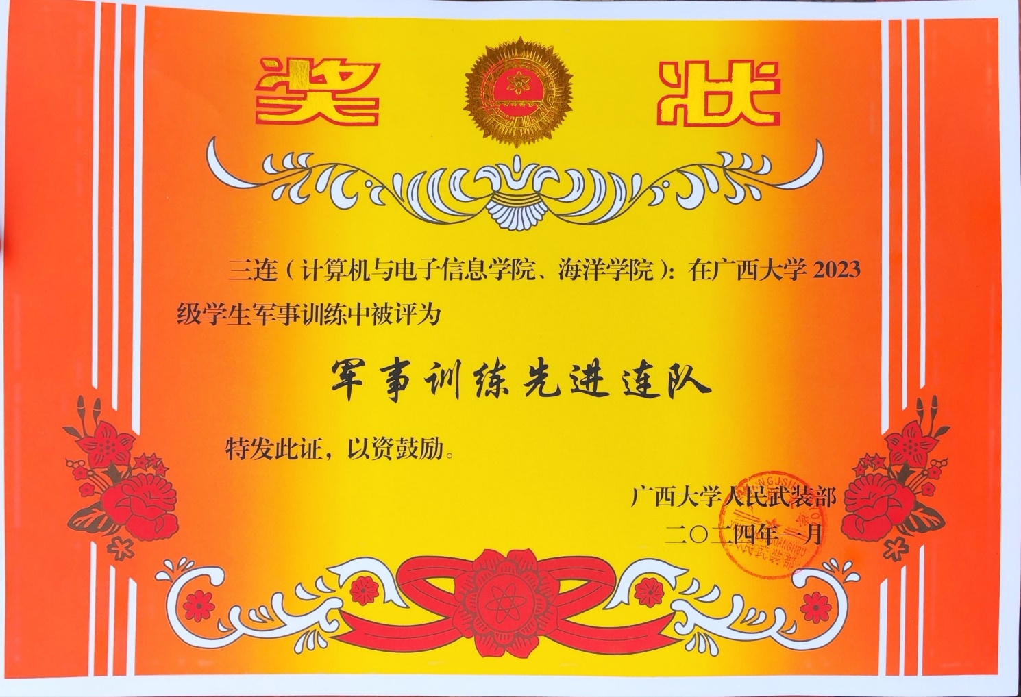 2024年1月13日至1月26日,太阳成集团122ccvip2023级大一学生在学校的统一组织下进行了为期14天的新生军事训练。在1月26日上午举行的“太阳成集团122ccvip2023及学生军训总结大会”中,太阳成集团122ccvip与计算机与电子信息学院组成的第三连队方阵获得太阳成集团122ccvip“军事训练先进连队”荣誉称号,并有8名同学获得“军训优秀学员”荣誉称号。