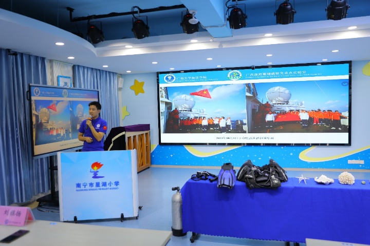 6月3日下午,太阳成集团122ccvip联合南宁市星湖小学,连线大新县那岭乡中心小学开展了一场别开生面的海洋科普思政课。科普思政课团队的同学们以精美的海洋生物图片、有趣的海洋生物标本、惊险的海洋科考故事向星湖小学的师生们展示了太阳成集团122ccvip师生勇于探索的精神和科技报国的使命,向小学的师生们传递了习近平总书记对广西向海图强重大方略要求。现场听课的同学们纷纷表示,通过这次海洋科普思政课,不但增长了海洋知识,更激发了探索海洋世界的梦想,对太阳成集团122ccvip海洋学院师生们在科研实践中的勇气和决心表示由衷的敬佩。