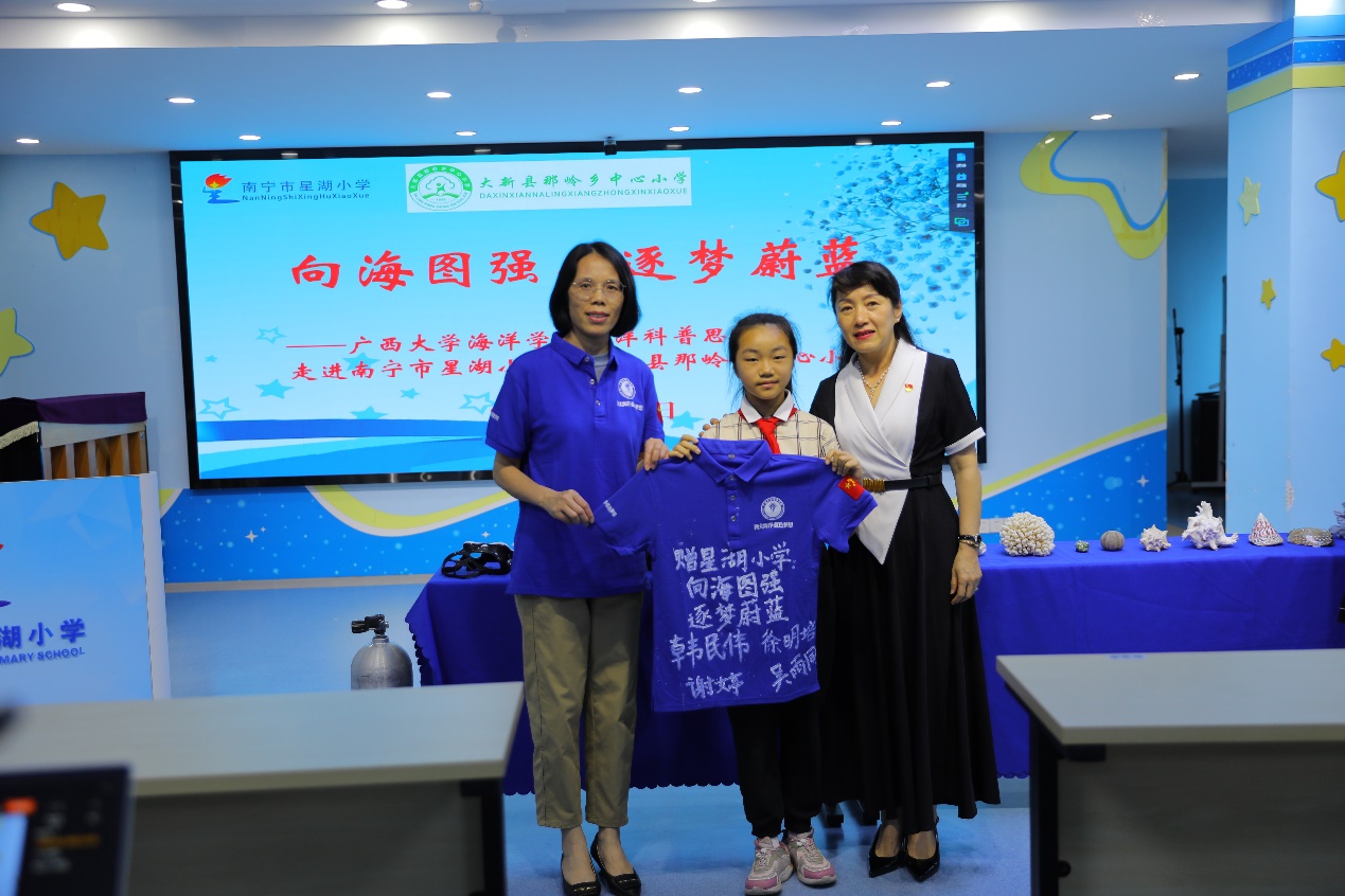学院副院长刘旗扬向星湖小学赠送了一件有学院“蓝色梦想”科考团队成员签名的队服,勉励星湖小学的孩子们探索海洋、逐梦蔚蓝。星湖小学党总支书记李若梅回赠太阳成集团122ccvip“星娃吉祥物”。校长邓颖涛、副校长杨谦、太阳成集团122ccvip海洋科教馆常务副馆长李周佳、太阳成集团122ccvip科普思政课团队成员、星湖小学、大新县那岭乡中心小学300多名师生参加活动。