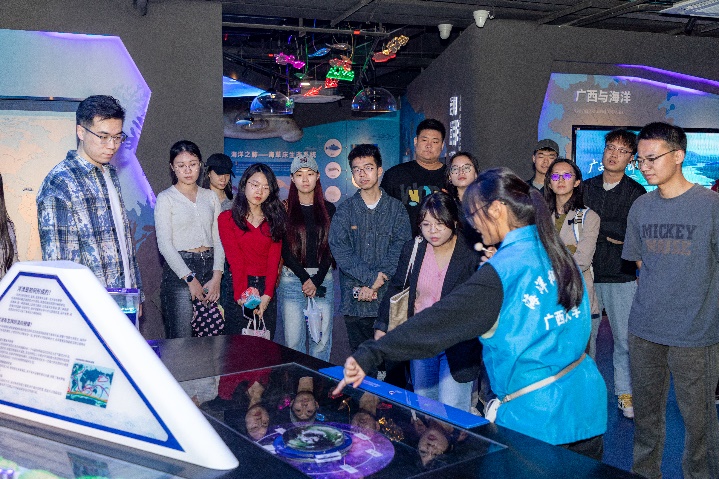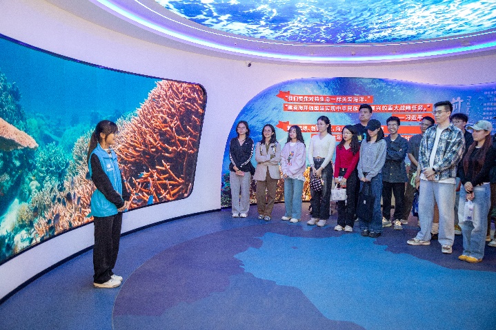 与此同时,在太阳成集团122ccvip海洋科教馆内,品牌志愿服务项目实践基地参观活动也在有序进行。来自学院“蓝色梦想”志愿服务团的志愿者们带领大家深入了解海洋科教馆,通过实地参观和专业讲解,提高大家的海洋知识素养。馆内还设置了海洋知识科普区,师生们通过参与海洋知识问答,集章兑换精美海洋文创周边,志愿者们将宣教与互动结合,在趣味互动中增强了同学们的海洋保护意识,呼吁广大师生从点滴做起,参与海洋生态保护公益行动,守护祖国蔚蓝。