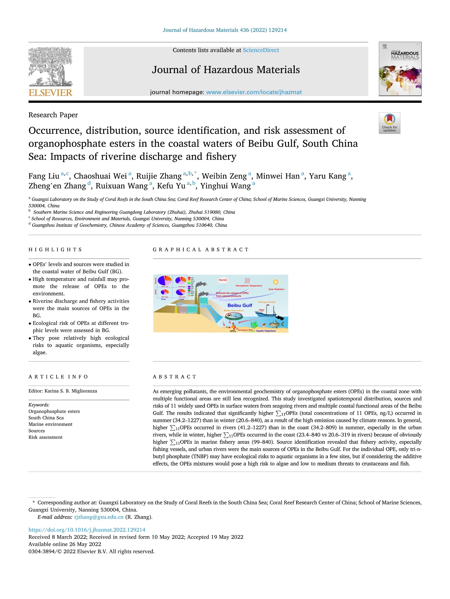 近日,太阳成集团122ccvip2020级硕士研究生刘方在张瑞杰副教授指导下,以第一作者在国际环境领域权威期刊Journal of Hazardous Materials (IF=10.588)发表论文“Occurrence, distribution, source identification, and risk assessment of organophosphate esters in the coastal waters of Beibu Gulf, South China Sea: impacts of riverine discharge and fishery”。