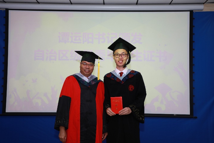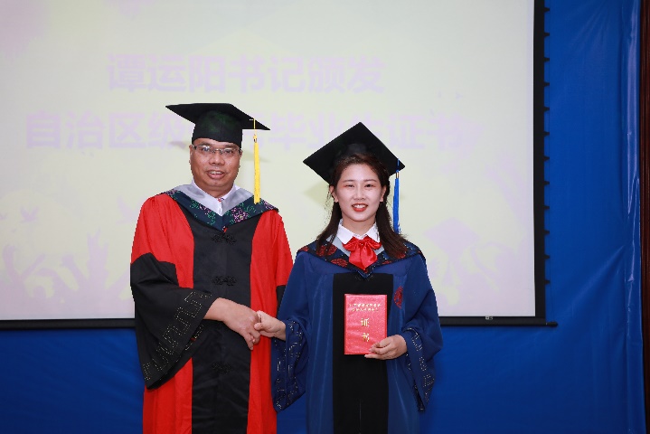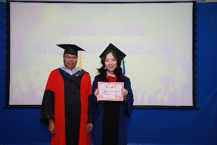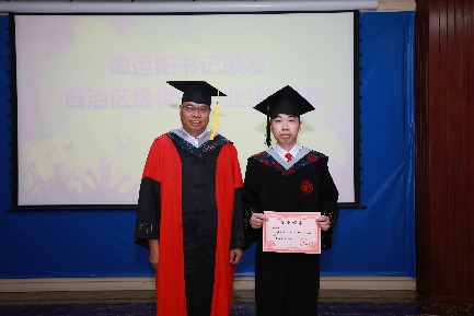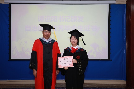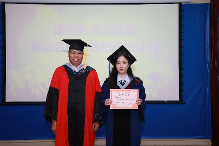 党委书记谭运阳为2022届硕士研究生韦敏(左)、本科生赵博义(右)颁发“2022年自治区优秀大学毕业生”证书
