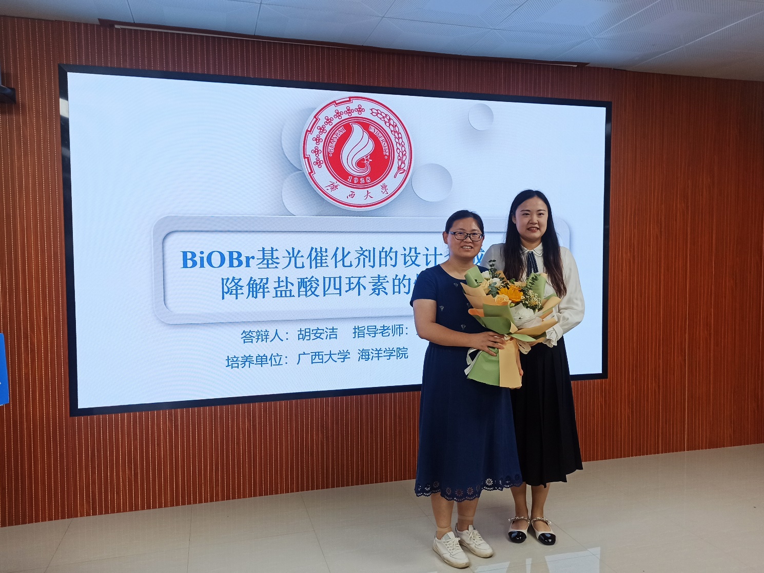 胡安洁同学(导师:王丽伟副教授)主要对水体抗生素高效降解进行了相关研究,其论文题目是《BiOBr基光催化剂的设计合成及其降解盐酸四环素的性能研究》。胡安洁本科毕业于济南大学化学化工学院,于2019年9月考研至本校就读研究生,主要研究方向为海洋环境与化学。读研期间,担任院硕士研究生第二党支部副书记兼纪检委员,并以导师一作学生二作在国际环境领域一区期刊《Applied Surface Science》上发表一篇SCI论文:《Degradation of tetracycline hydrochloride (TCH) by active photocatalyst rich in oxygen vacancies: Performance, transformation product and mechanism》。