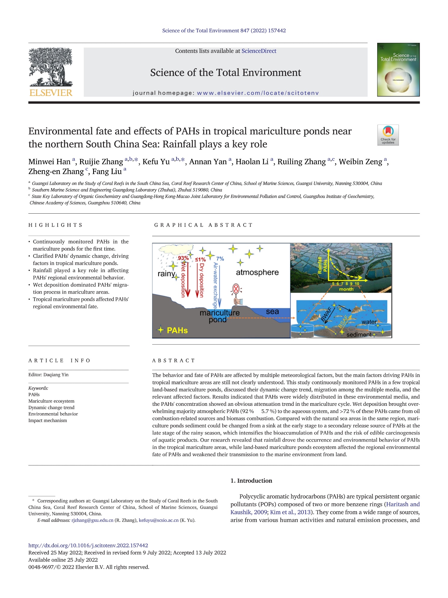 Han Minwei, Zhang Ruijie, Yu Kefu, Yan Annan, Li Haolan, Zhang Ruiling, Zeng Weibin, Zhang Zheng-en, Liu Fang. Environmental fate and effects of PAHs in tropical mariculture ponds near the northern South China Sea: Rainfall plays a key role. Science of the Total Environment, 2022. 847, 157442. https://doi.org/10.1016/j.scitotenv.2022.157442.