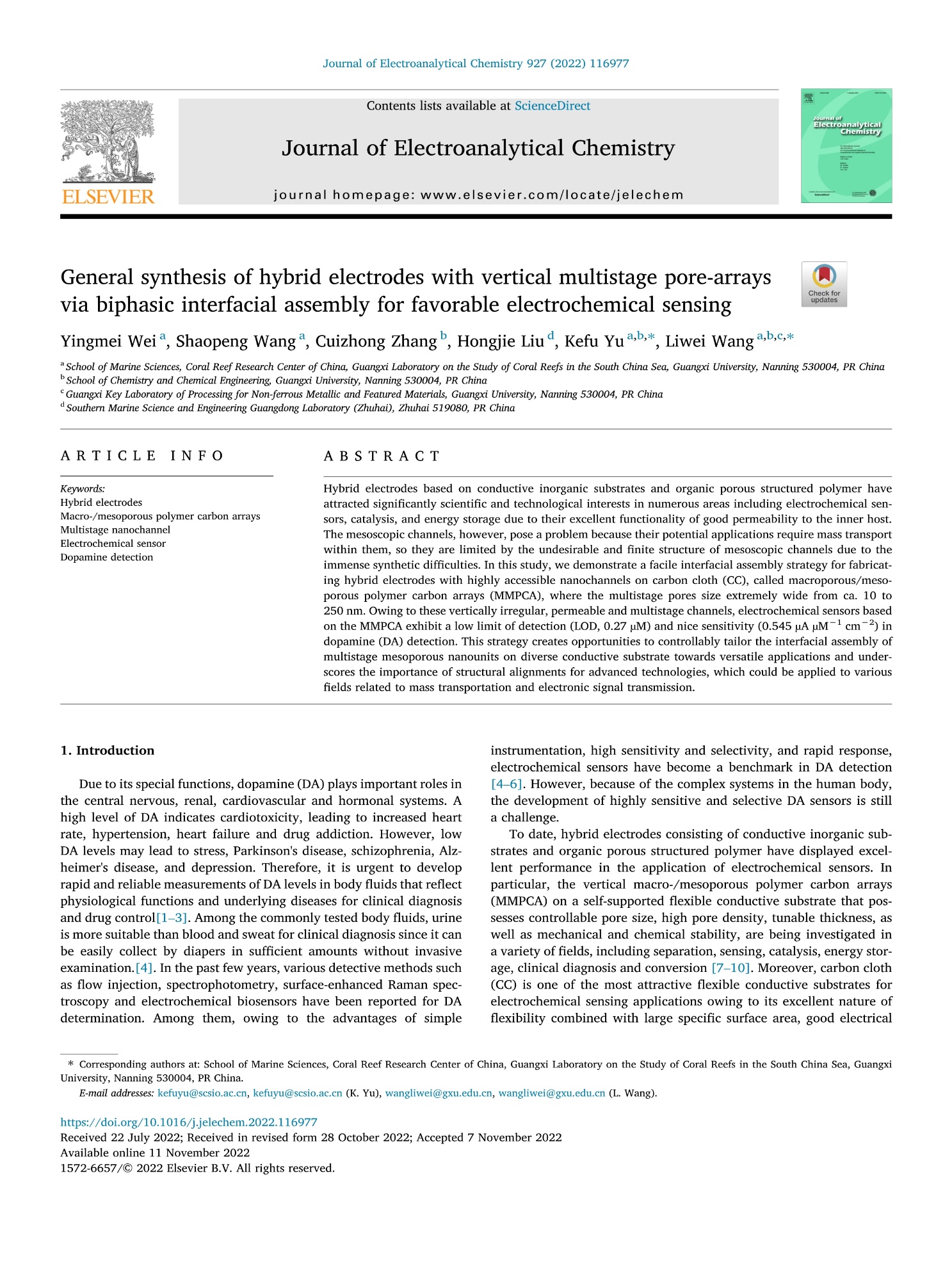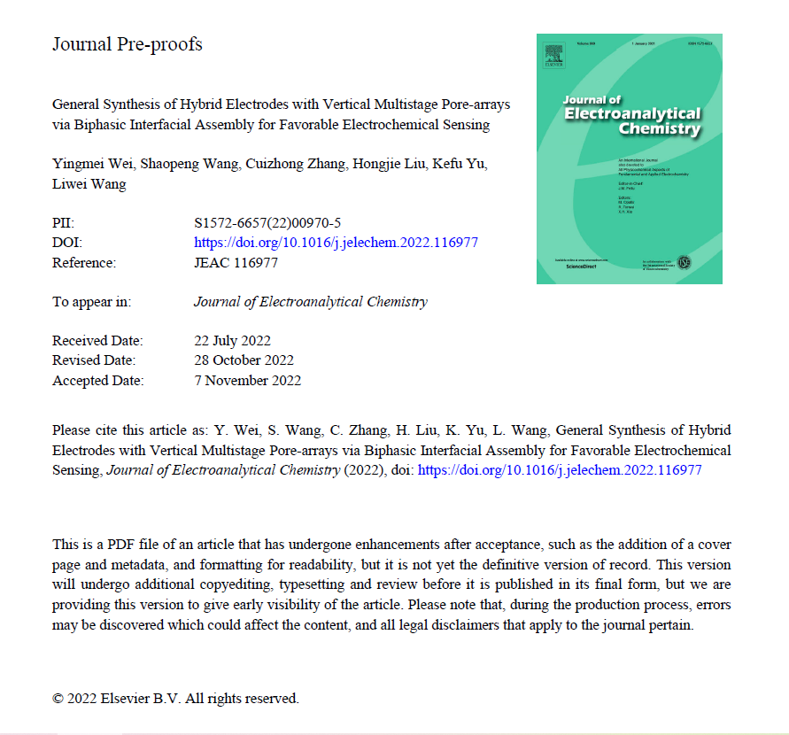 文章信息如下:Wei Yingmei, Wang Shaopeng, Zhang Cuizhong, Liu Hongjie, Yu Kefu, Wang Liwei. General Synthesis of Hybrid Electrodes with Vertical Multistage Pore-arrays via Biphasic Interfacial Assembly for Favorable Electrochemical Sensing. 2022, DOI: 10.1016/j.jelechem.2022.116977.