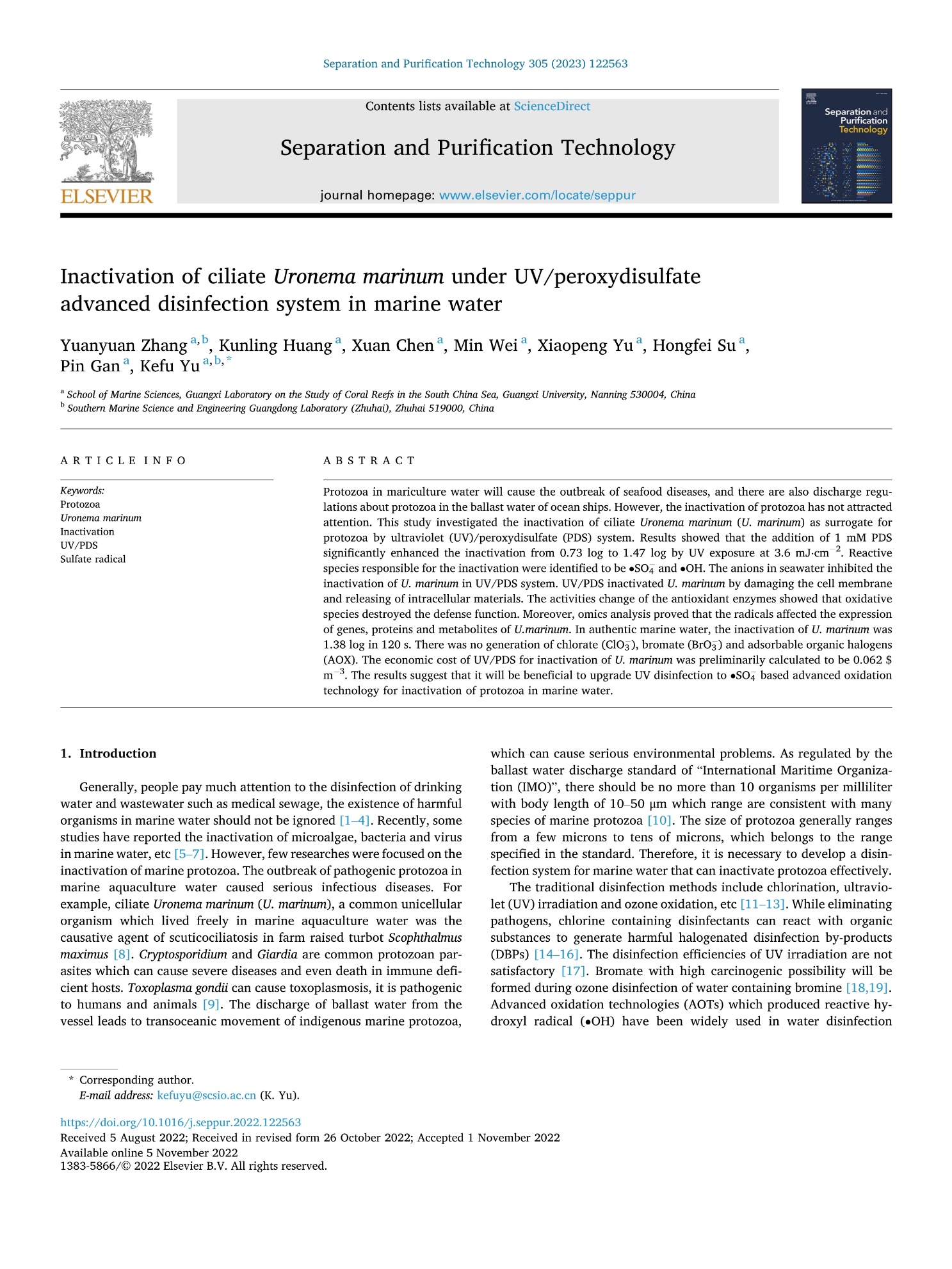 论文信息如下:Zhang Yuanyuan, Huang Kunling, Chen Xuan, Wei Min, Yu Xiaopeng, Su Hongfei, Gan Pin, Yu Kefu*. 2022. Inactivation of ciliate Uronema marinum under UV/peroxydisulfate advanced disinfection system in marine water. Separation and Purification Technology, 305: 122563, https://doi.org/10.1016/j.seppur.2022.122563.