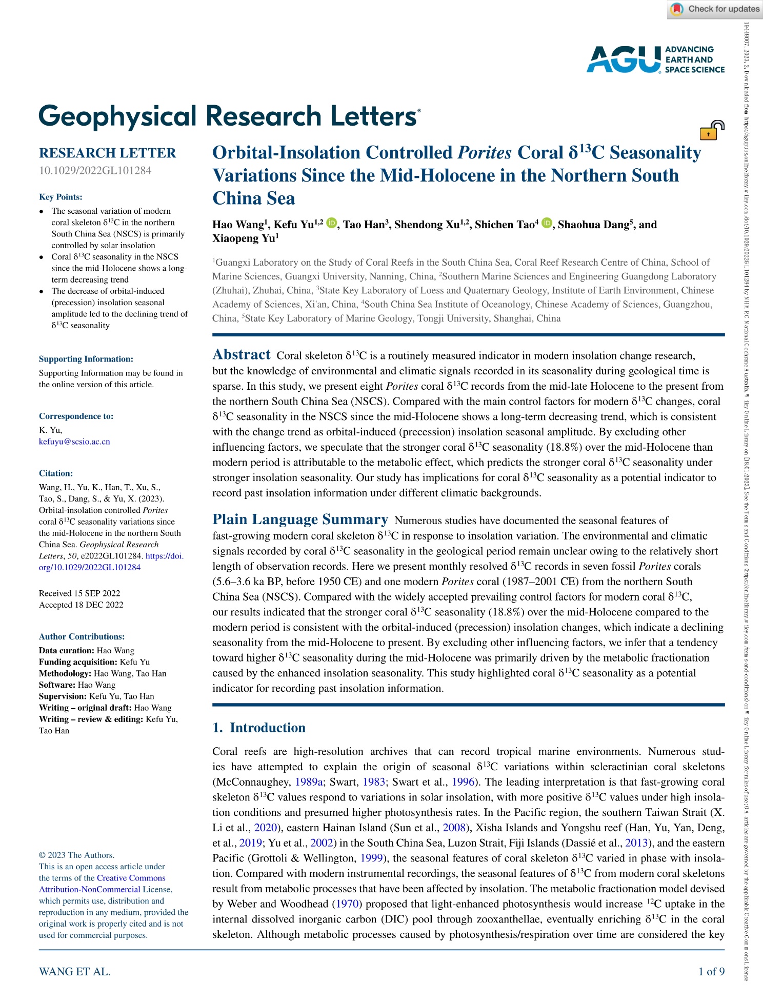 太阳成集团122ccvip博士研究生王浩为第一作者的研究论文“Orbital-insolation controlled Porites coral δ13C seasonality variations since the mid-Holocene in the northern South China Sea”,在SCI一区Top刊物Geophysical Research Letters发表。该文揭示了珊瑚骨骼δ13C的季节性变化特征具有记录过去日照信息的潜力。