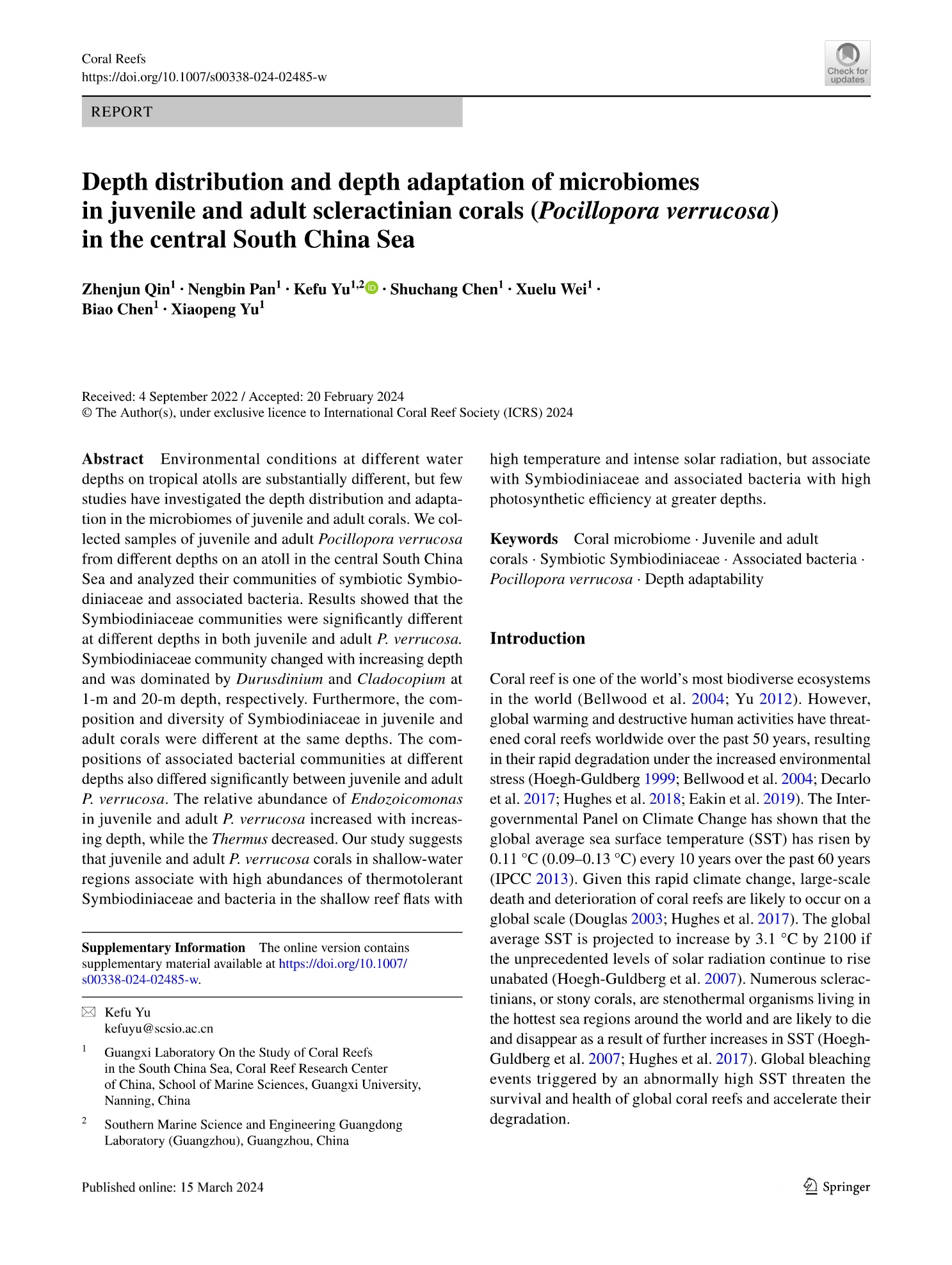 Qin Zhenjun, Pan Nengbin, Yu Kefu, Chen Shuchang, Wei Xuelu, Chen Biao, Yu Xiaopeng. (2024). Depth distribution and depth adaptation of microbiomes in juvenile and adult scleractinian corals (Pocillopora verrucosa) in the central South China Sea. Coral Reefs. https://doi.org/10.1007/s00338-024-02485-w
