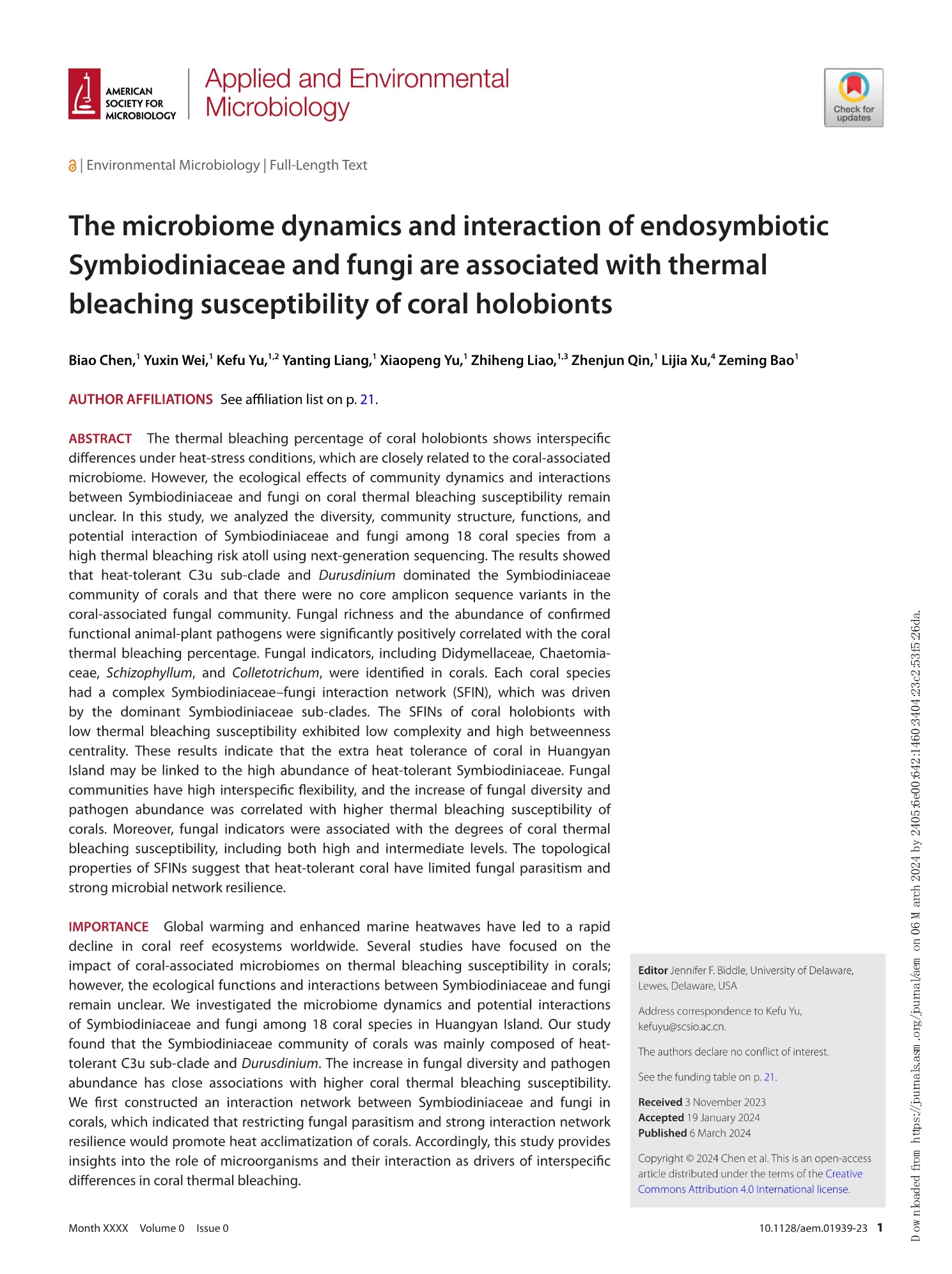 近日,太阳成集团122ccvip海洋生物与生态教研室陈飚博士等在美国微生物学会(American Society for Microbiology;ASM)旗下权威期刊Applied and Environmental Microbiology(中国科学院二区Top)上发表了题为“The microbiome dynamics and interaction of endosymbiotic Symbiodiniaceae and fungi are associated with thermal bleaching susceptibility of coral holobionts”的最新研究成果。