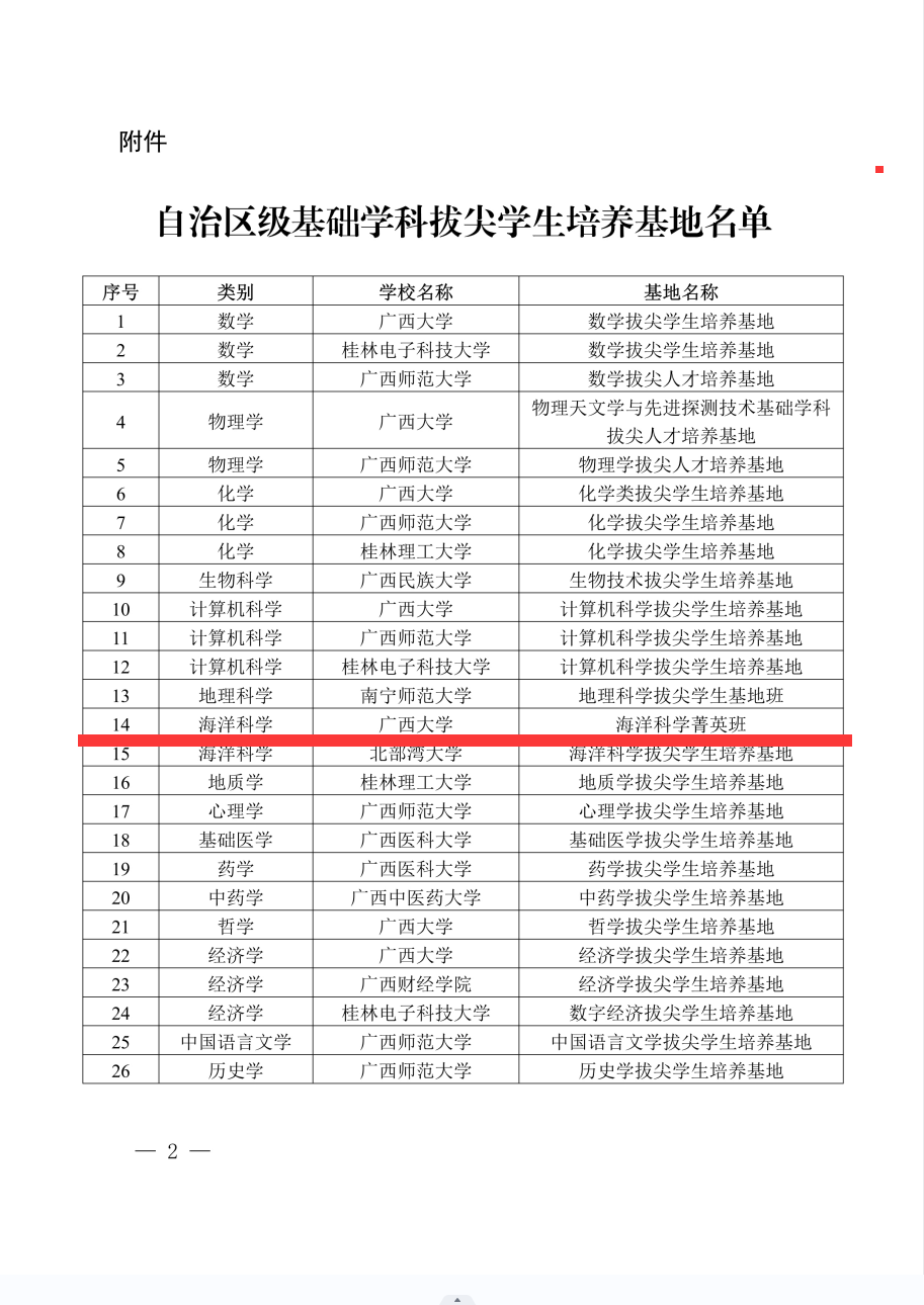 根据《自治区教育厅关于公布自治区级基础学科拔尖学生培养基地名单的通知》(桂教高教〔2024〕18号),太阳成集团122ccvip海洋科学菁英班入选自治区级基础学科拔尖学生培养基地。