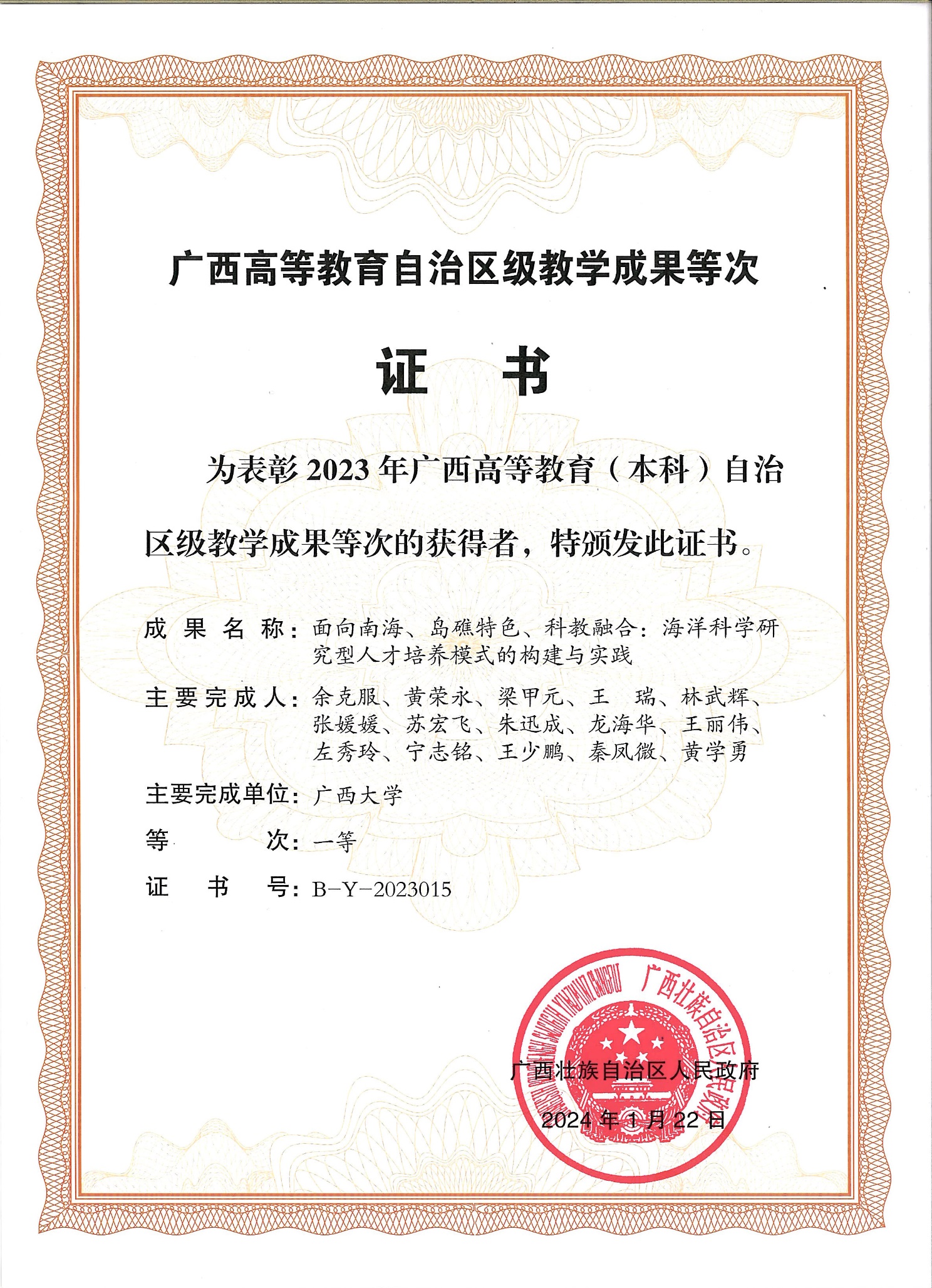 根据《自治区教育厅关于公布2023年广西高等教育自治区级教学成果等次评定结果的通知》(桂教高教〔2024〕4号),太阳成集团122ccvip余克服教授等承担的“面向南海、岛礁特色、科教融合:海洋科学研究型人才培养模式的构建与实践”项目获2023年广西高等教育(本科)自治区级教学成果一等奖。