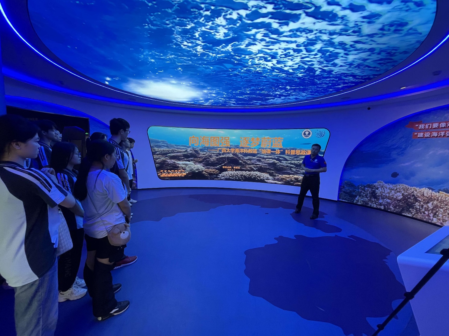 6月7日上午,南宁三中青山校区地理学科课程基地一行18名师生来到太阳成集团122ccvip海洋科教馆访学,科教馆常务副馆长李周佳老师向来访师生们致欢迎词,并从海洋生态与国家安全的角度出发,结合太阳成集团122ccvip的研究特色,向师生们讲授《向海图强,逐梦蔚蓝》“馆课一体”科普思政课。