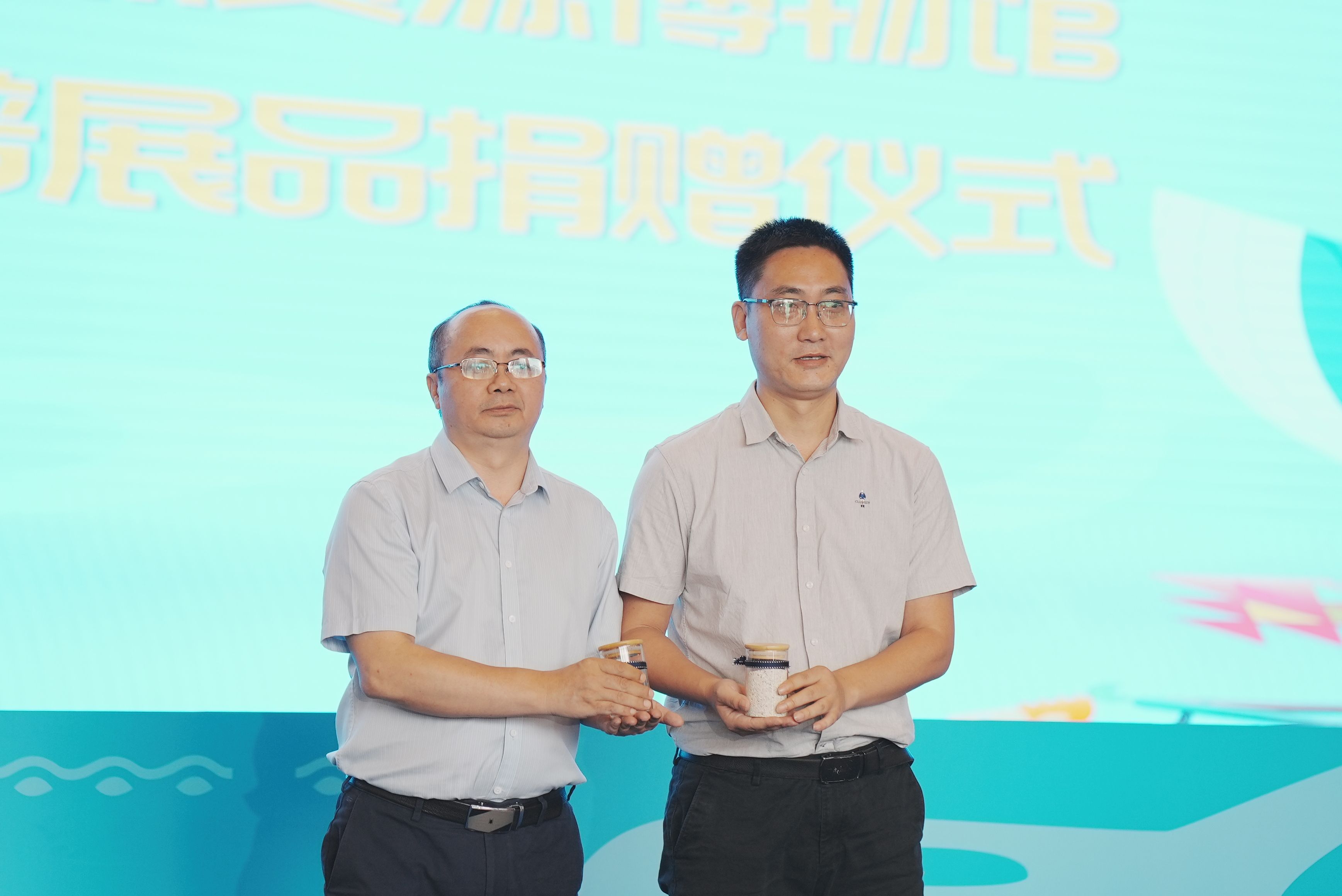 学院副院长王瑞与广西自然资源博物馆副馆长韦家宏进行西沙群岛样品捐赠