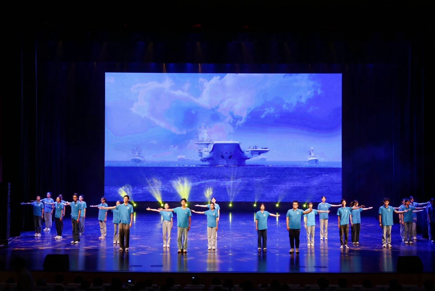 演出在激情澎湃的开场歌舞《我们的舰旗高高飘扬》中拉开序幕,彰显了学院师生团结协作、积极向上的精神风貌。