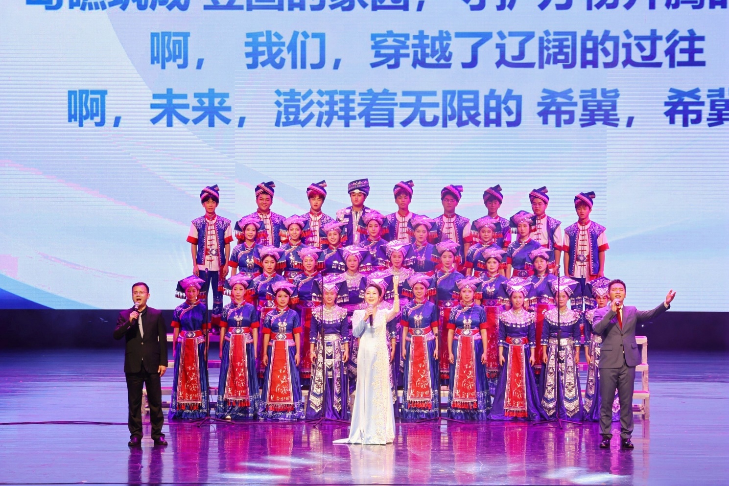 在《陆海统筹 共筑梦想》篇章中,艺术学院舞蹈系带来的瑶族女子群舞《日上·梯田》展现了自然的馈赠和民族团结的精神;艺术学院音乐系合唱《振鹭于飞》象征着纯洁与奋进,彰显了学术探索和精神力量的培养。节目不仅颂扬了学院精神,也传承了中华民族共同体价值观。