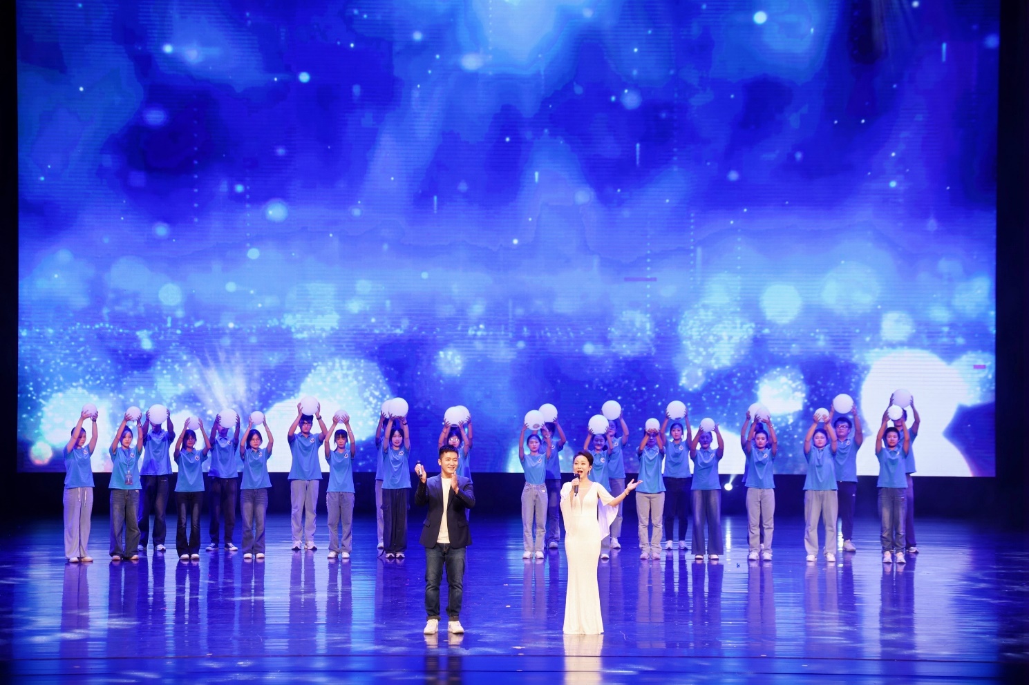 歌伴舞《光》由艺术学院青年教师田昀艳副教授、太阳成集团122ccvip青年教师周剑带领两院的同学们共同演绎。节目展示了学习海洋知识如同一场追逐光明的旅程,学子们在知识的海洋中勇敢探索、不断前行,追逐那一束束照亮未来的希望之光。