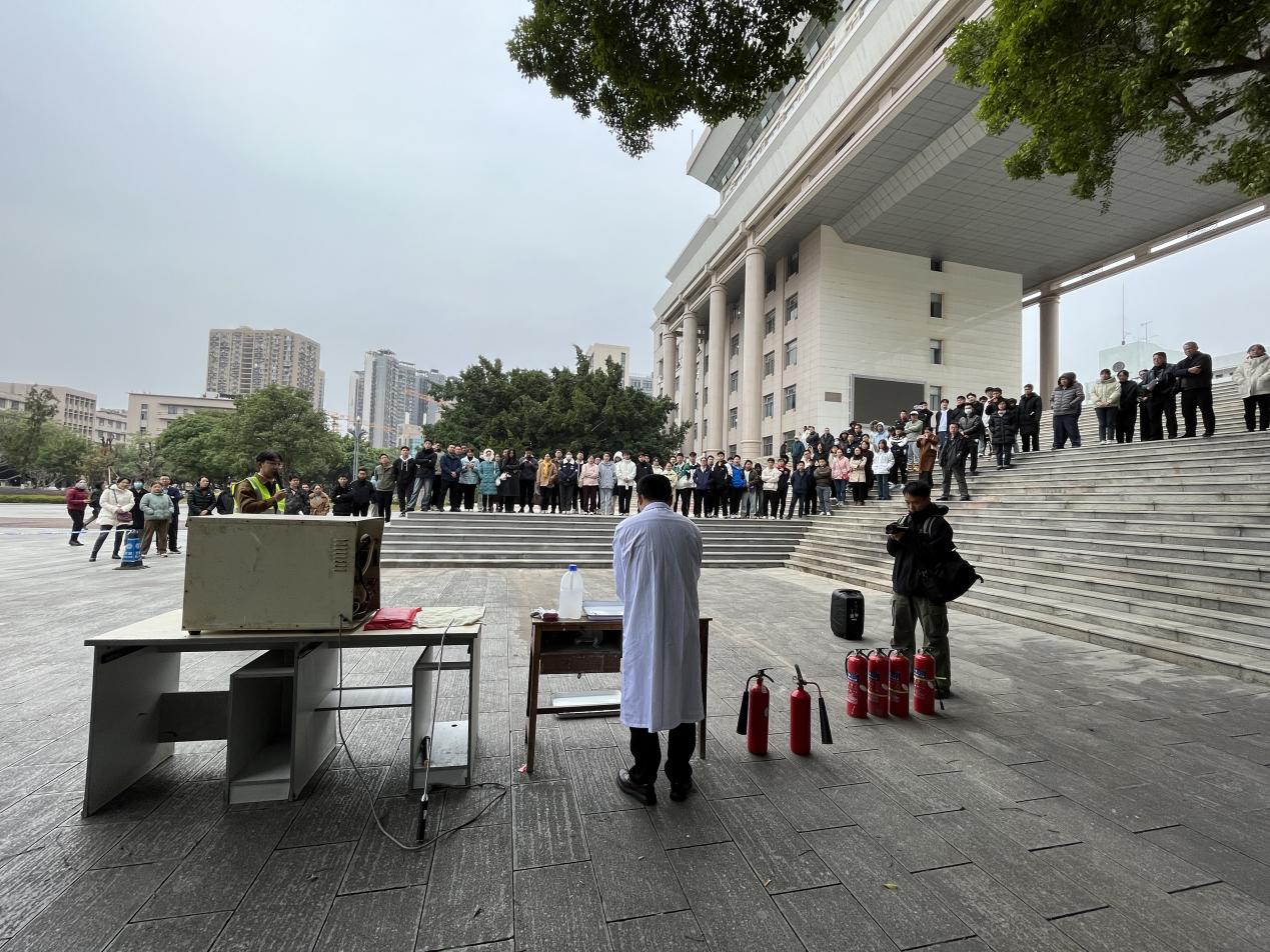 随后,活动第二个环节加热设备自燃着火演练在综合楼南面广场开展。由于通风干燥箱长时间加热或易燃物品违规加热易引发着火事故,且此类小事故在学校仍偶有发生,掌握正确的灭火方法对预防大事故极为关键。演练中,老师示范了加热设备着火场景并进行安全演练讲解,师生们现场模拟了面对“火情”迅速反应,熟练运用各类灭火器材进行扑救,有效提升了应对此类突发状况的实操技能。