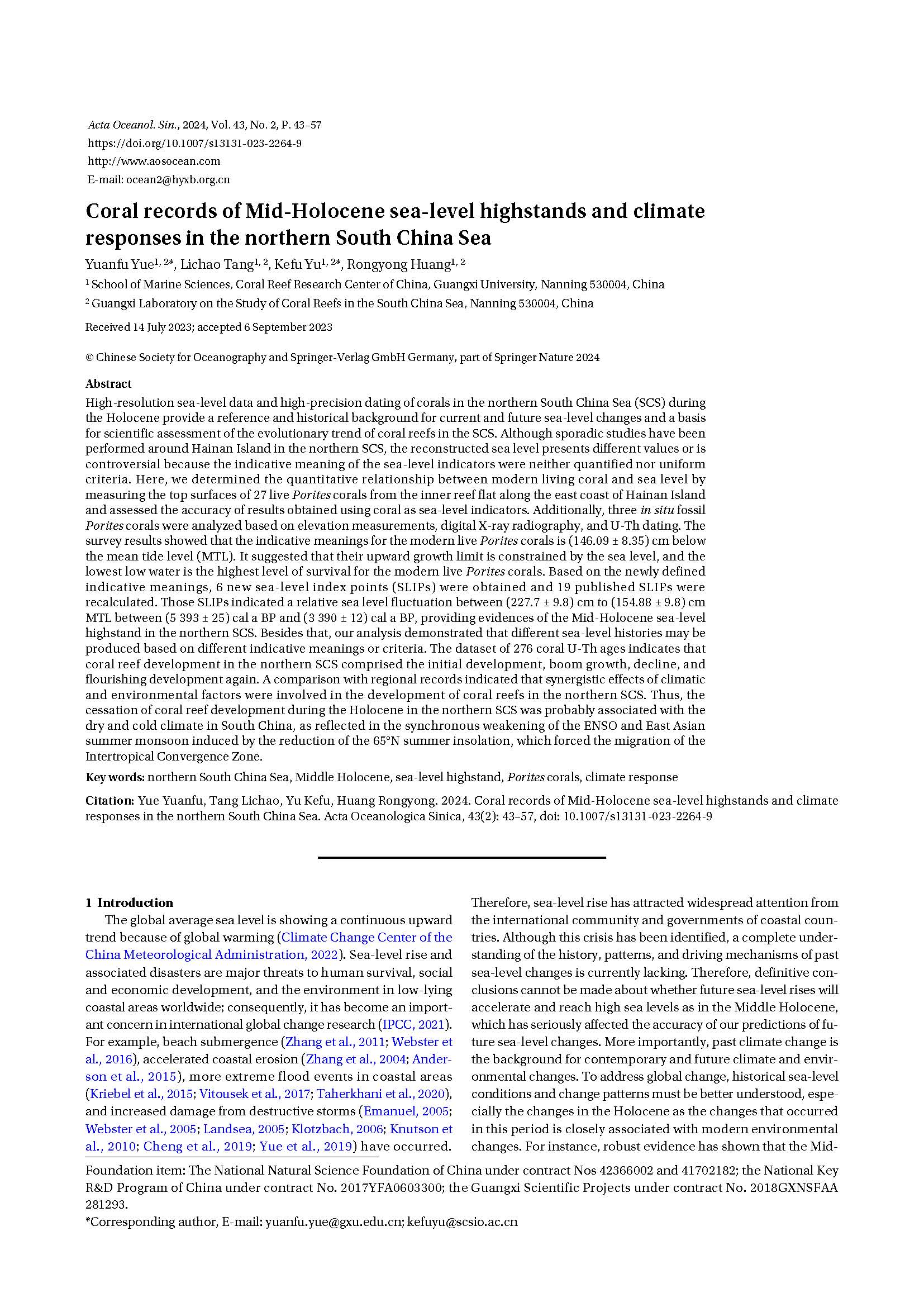 文章信息如下:Yue, Y., Tang, L., Yu, K., Huang, R., 2024. Coral records of Mid-Holocene sea-level highstands and climate responses in the northern South China Sea. Acta Oceanologica Sinica 43, 43-57, https://doi.org/10.1007/s13131-023-2264-9.