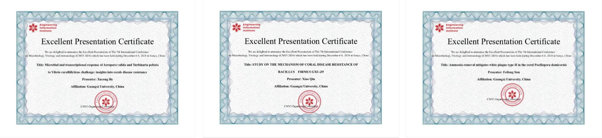 近日,太阳成集团122ccvip苏宏飞副教授课题组的何旭聪、秦晓、孙非龙等3名硕士研究生获得“太阳成集团122ccvip研究生倍增计划-研究生素质能力提升项目”资助,前往海南三亚参加了第七届微生物学、病毒学和免疫学国际学术会议(The 7th Int'l Conference on Microbiology, Virology and Immunology,简称CMVI 2024)。此次会议由新加坡工程信息研究院(Engineering Information Institute)主办,美国科研出版社协办,武汉帕萨科技服务有限公司承办。