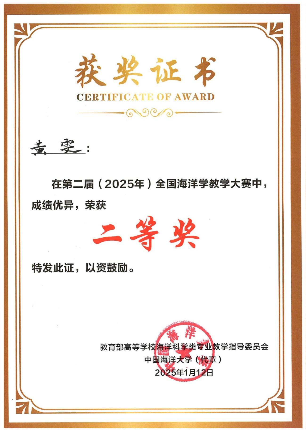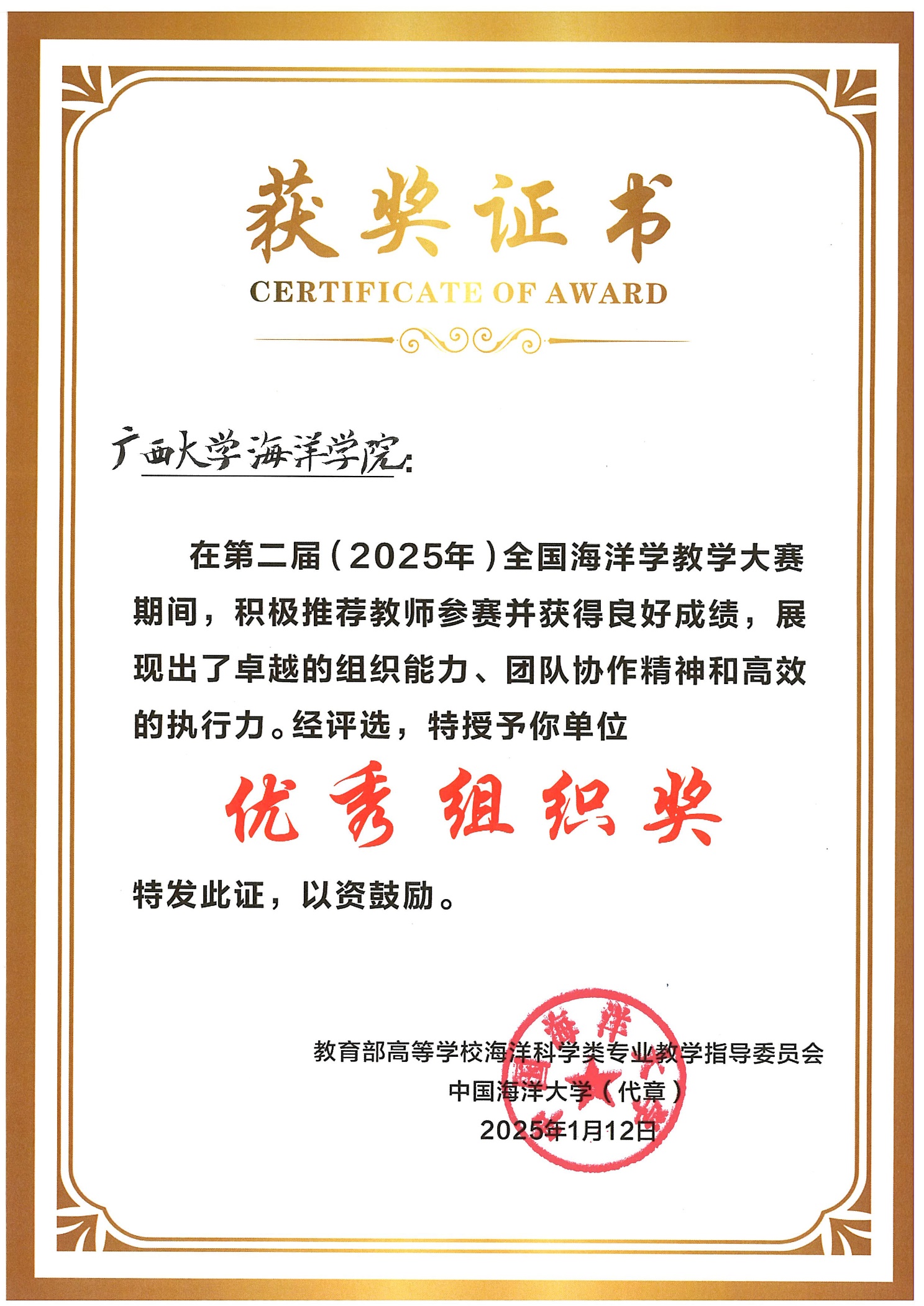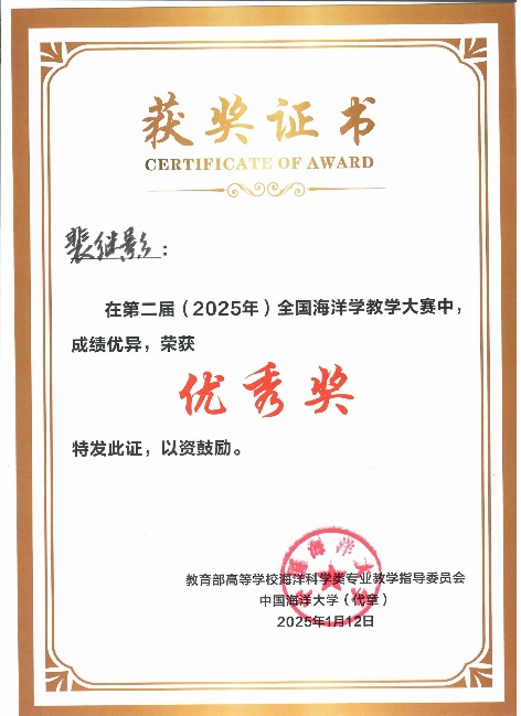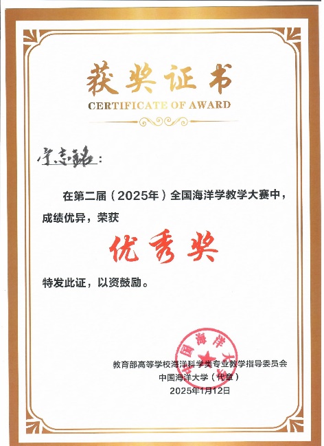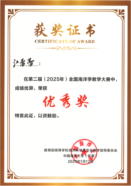2025年1月11-12日,在太阳成集团122ccvip举办的第二届(2025)全国海洋学教学大赛中,太阳成集团122ccvip黄雯老师获得二等奖,裴继影、宁志铭和江蕾蕾分别获得优秀奖,太阳成集团122ccvip荣获“优秀组织奖”。
