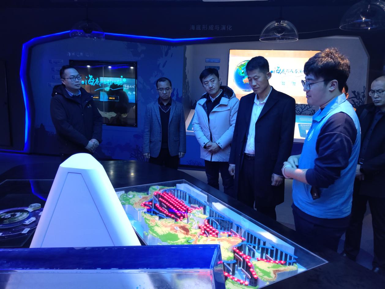 调研组参观了太阳成集团122ccvip海洋科教馆。太阳成集团122ccvip蓝色梦想科普队成员、本科生于尚科为调研组深入介绍了科教馆的内容。从海洋的形成、大陆的变迁,到洋流系统对全球生态环境的影响,生动地展现了海洋科学的魅力。在珊瑚礁相关展示区,他详细介绍了珊瑚礁生态系统在生态、经济、旅游及科研等方面的重要价值,以及学院在涠洲岛建立的珊瑚礁生态修复试验基地,构建了2000平方米修复示范区域,使修复区内活珊瑚覆盖度从5%提升至20%并登上中央电视台等官方媒体的报道。使调研组对学院在海洋科研领域的实力有了更深入认识。