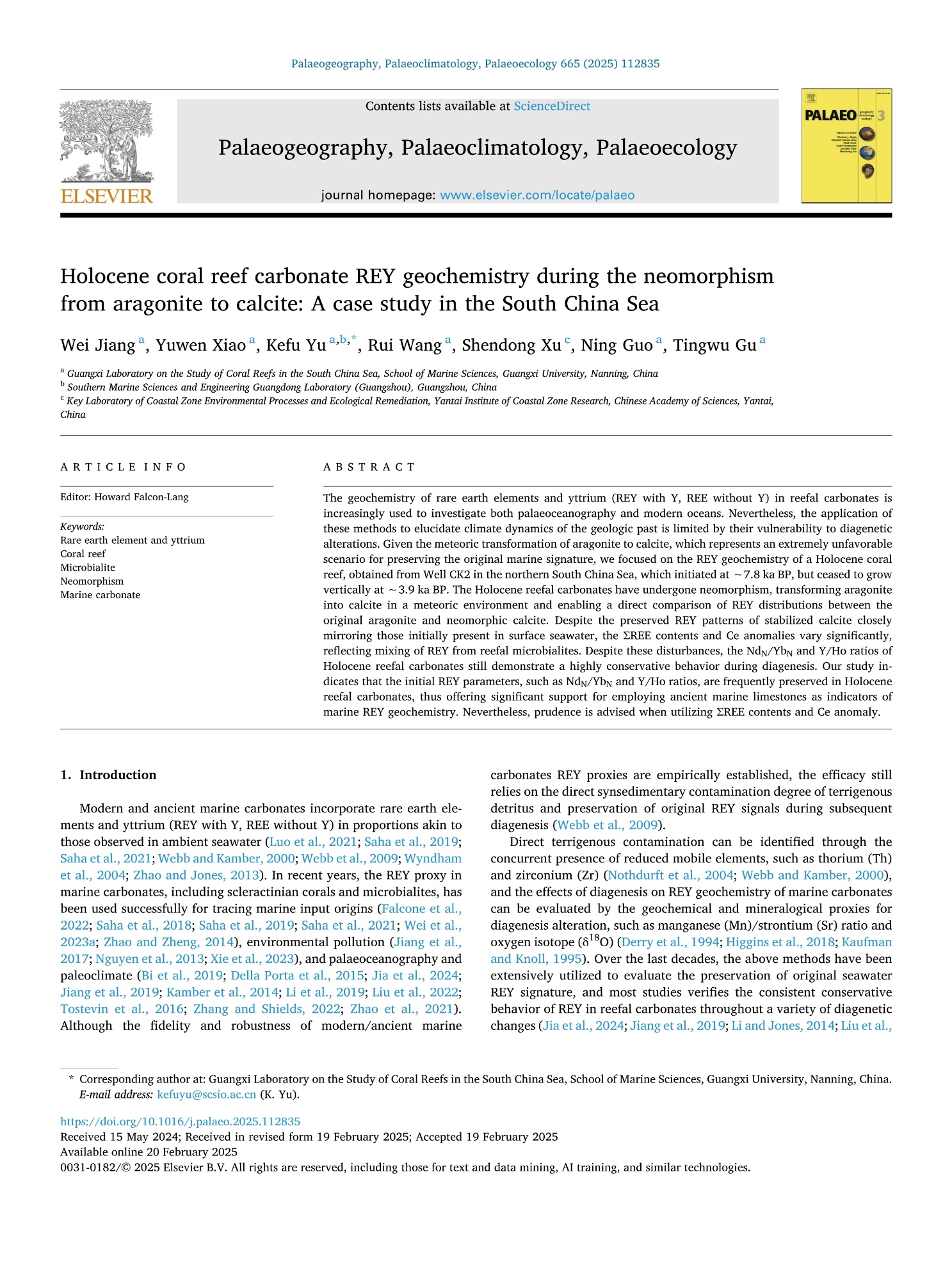 Jiang, W., Xiao, Y., Yu, K., Wang, R., Xu, S., Guo, N. and Gu, T. (2025) Holocene coral reef carbonate REY geochemistry during the neomorphism from aragonite to calcite: A case study in the South China Sea. Palaeogeography, Palaeoclimatology, Palaeoecology, 665, 112835. https://doi.org/10.1016/j.palaeo.2025.112835