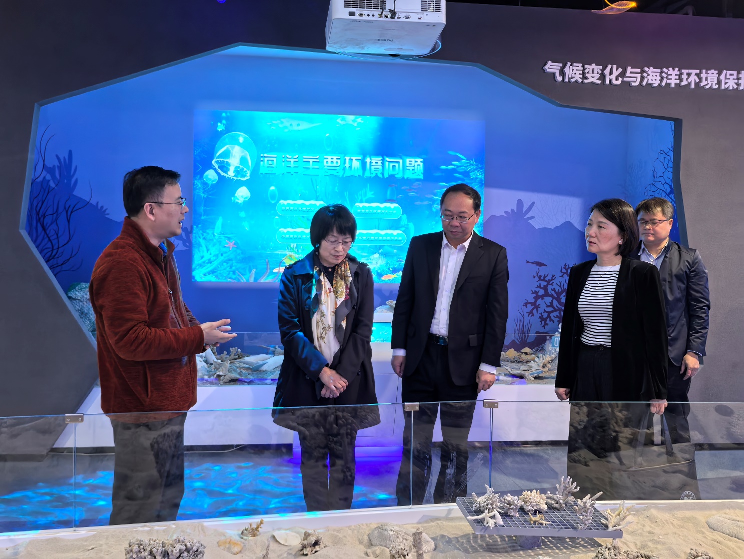 在海洋科教馆,科教馆常务副馆长李周佳向调研组汇报了学院在南海岛礁建设、海洋科考、生态环境保护等方面开展的工作情况。尤其是参与编写《黄岩岛海域生态环境调查评估报告》,充分展示了我国南海海洋生态环境保护成效,为服务国家政治外交大局提供了支撑保障。在岛礁生态修复实验室,调研组观看了活体珊瑚的人工培育,观看了涠洲岛陆基和海区可视化监控系统运行状况,了解了学院成立珊瑚礁保护与修复研究团队,研发以“人工修复带动自然恢复”为理念的珊瑚礁生态修复技术,建立了2000平方米的自然海域珊瑚修复示范区,经过3年的努力实现了活珊瑚覆盖率从5%提高到20%,带动了周边海域珊瑚礁的自然恢复。赵浩对太阳成集团122ccvip聚焦珊瑚礁研究所取得的成效给予了高度评价,她建议两校进一步加强在科技成果转化、学科交叉融合等方面的合作。