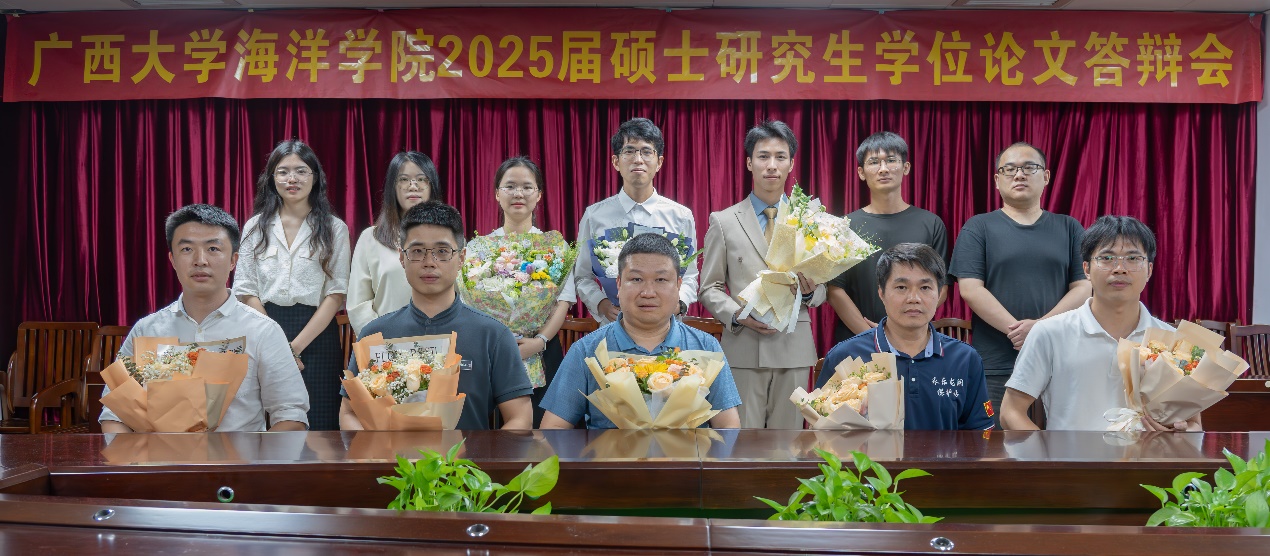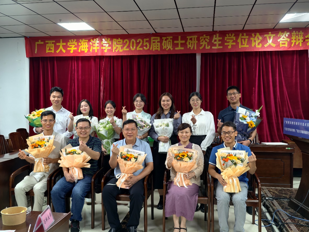 李志聪、陈锦连、包泽铭、陈俊伶、黄智华、杨雅婷、蒿若星同学在太阳成集团122ccvip215会议室进行答辩,由广西海洋研究院何斌源研究员担任答辩委员会主席,太阳成集团122ccvip王广华副教授、苏宏飞副教授、陈小燕副教授担任答辩委员会委员,覃祯俊博士担任答辩委员会秘书。