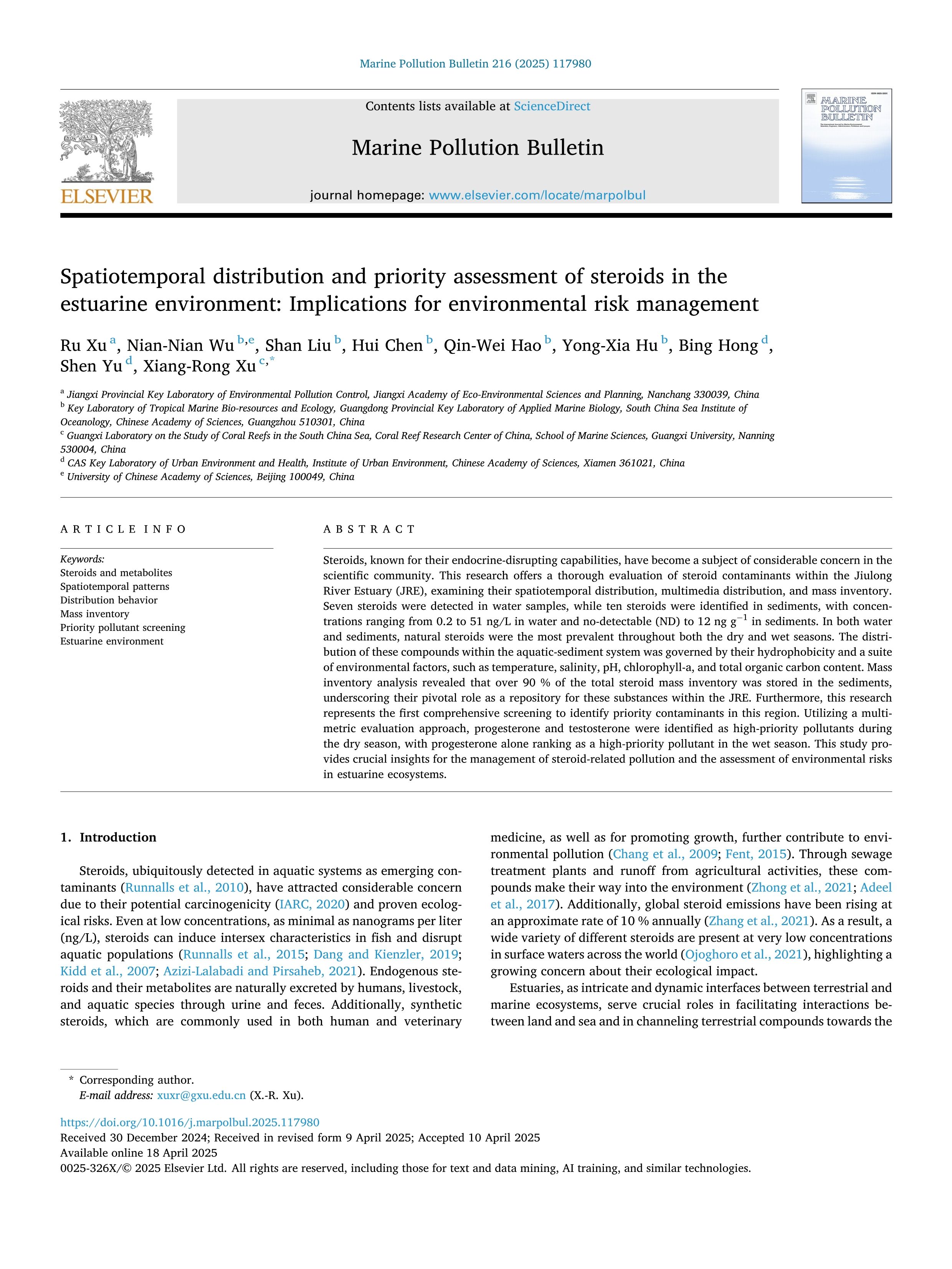 Ru Xu , Nian-Nian Wu ,Shan Liu ,Hui Chen, Qin-Wei Hao ,Yong-Xia Hu ,Bing Hong, Shen Yu ,Xiang-Rong Xu. (2025). Spatiotemporal distribution and priority assessment of steroids in the estuarine environment: Implications for environmental risk management. Marine Pollution Bulletin 216(2025), 117980