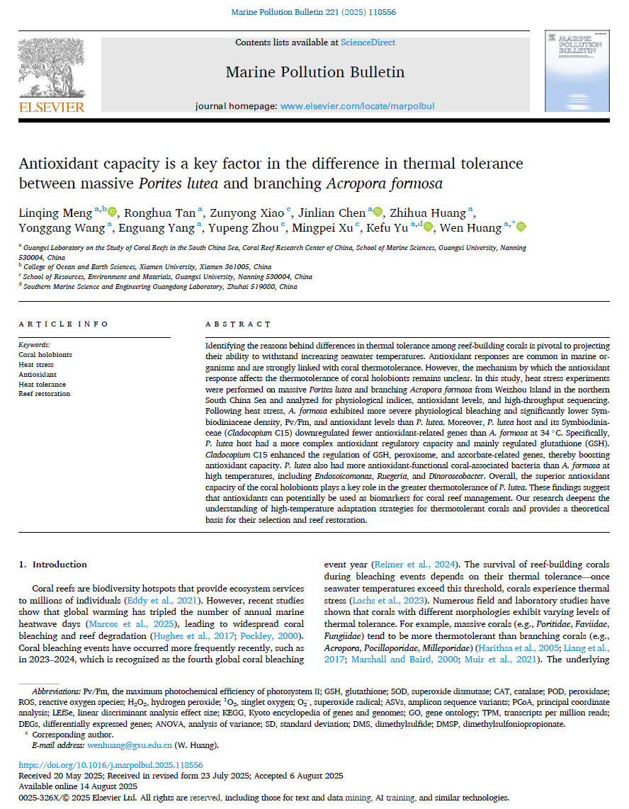 Meng Linqing, Tan Ronghua, Xiao Zunyong, Chen Jinlian, Huang Zhihua, Wang Yonggang, Yang Enguang, Zhou Yupeng, Xu Mingpei, Yu Kefu, Huang Wen. (2025). Antioxidant capacity is a key factor in the difference in thermal tolerance between massive Porites lutea and branching Acropora formosa. Marine Pollution Bulletin, 2025, 221: 118556.
