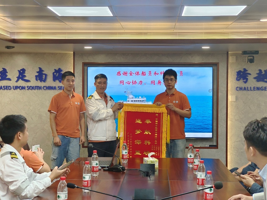 The team members of "Blue Dream" presented banners to the South China Sea Institute of Oceanology of the Chinese Academy of Sciences and the team members of the "Shiyan 6" scientific expedition vessel