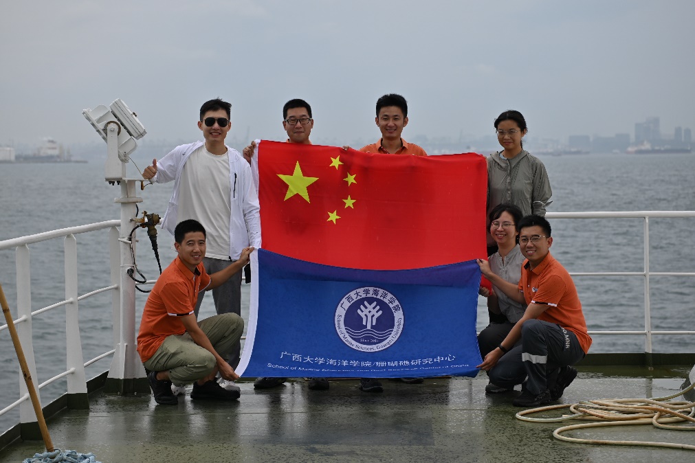 The "Blue Dream" scientific expedition team organized the 2023 comprehensive scientific expedition to Yongle Atoll of Xisha Islands (left: Dr. Chen Biao; Second from left: Xia Ronglin, PhD candidate; Third from Left: Dr. Qin Zhenjun)